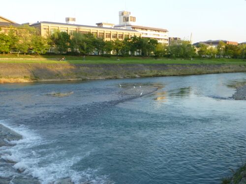 夕方、すっかり落ち着きを取り戻した鴨川沿いをそぞろ歩き。 水がひくと同時に、川の中に再び中州があらわれはじめました。 中州に集まっていた白鷺たち。 よく見ると、あれれ? もしかして大・中・小と揃い踏み? 写真の一番左にいたサギさん、チュウサギさ…