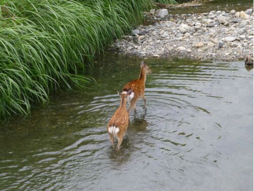 7月2日(水) 「半夏生(はんげしょうず)」のこの日は蒸し暑い一日でした。 夕方、出町柳の河合橋のところに人が集まっていて、 皆が何やら写真を撮っておられるので、橋の下をのぞいてみたら、 鹿が川の中におりました。 今回は2頭の鹿さん♪ 鹿さんその…
