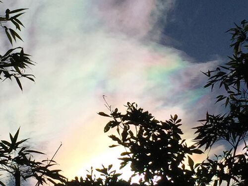 ふと見上げた空、雲が虹色になっていました…彩雲です。 虹色はどんどん変化して、 左上の雲はなんだか、虹色の天使が飛んでいるよう♡ 今度はまるで、虹色のショールを広げたよう♪ そしてまた、色はどんどん変化していって、 星が爆発して、虹が広がっている…